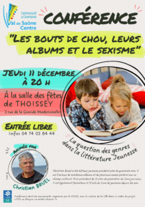 Le jeudi 11 décembre à 20h, la salle des fêtes de Thoissey accueillera en soirée une conférence animée par Christian BRUEL (auteur, éditeur et formateur à l’école du livre de jeunesse) sur la question des genres dans la littérature jeunesse.