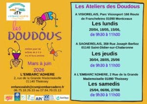 - au centre social L’Embarcadère à Thoissey (2 rue de la Grande Mademoiselle), les samedis de 9h30 à 11h aux dates suivantes pour le second trimestre 2026: