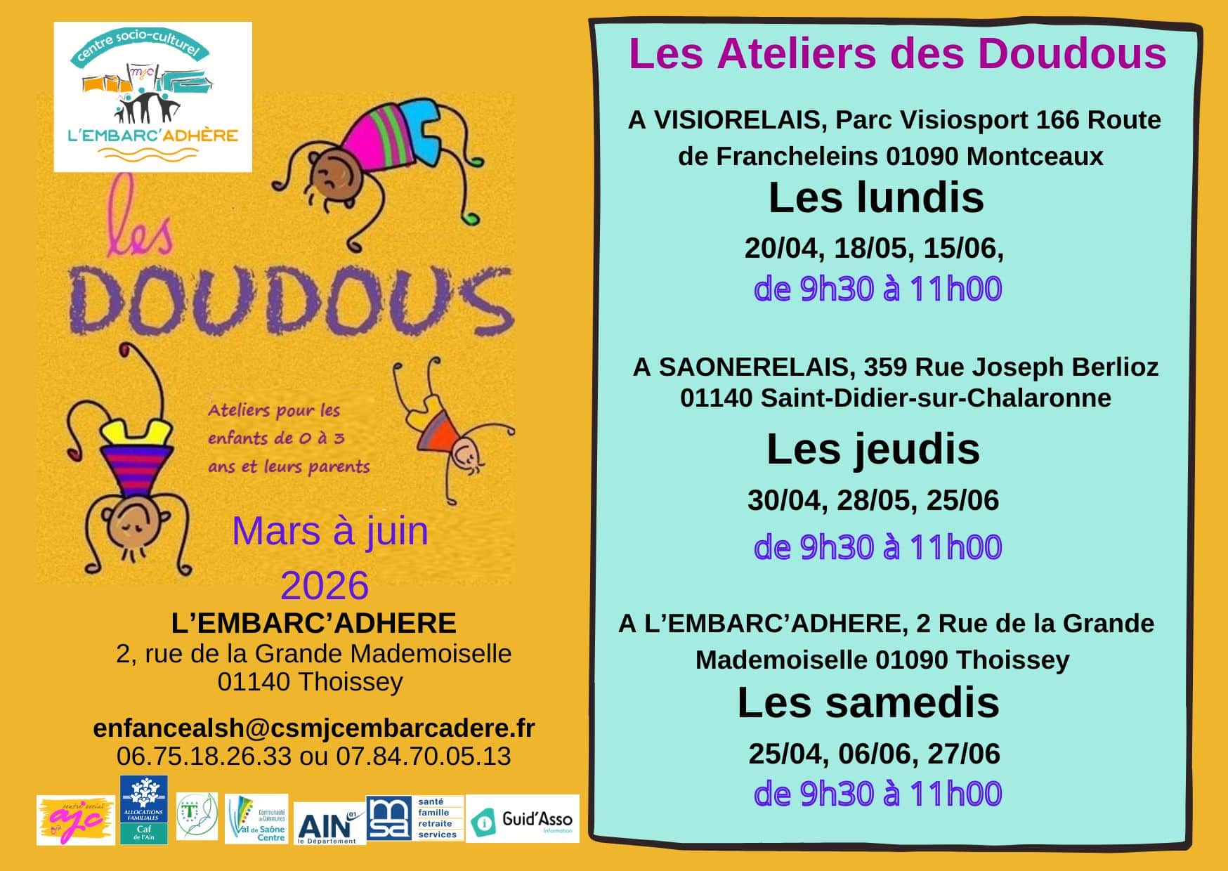 - au Relais Petite Enfance SaôneRelais à Saint-Didier-sur-Chalaronne (359 rue Joseph BERLIOZ 01140 ) les jeudis de 9h30 à 11h aux dates suivantes pour le second trimestre 2026: